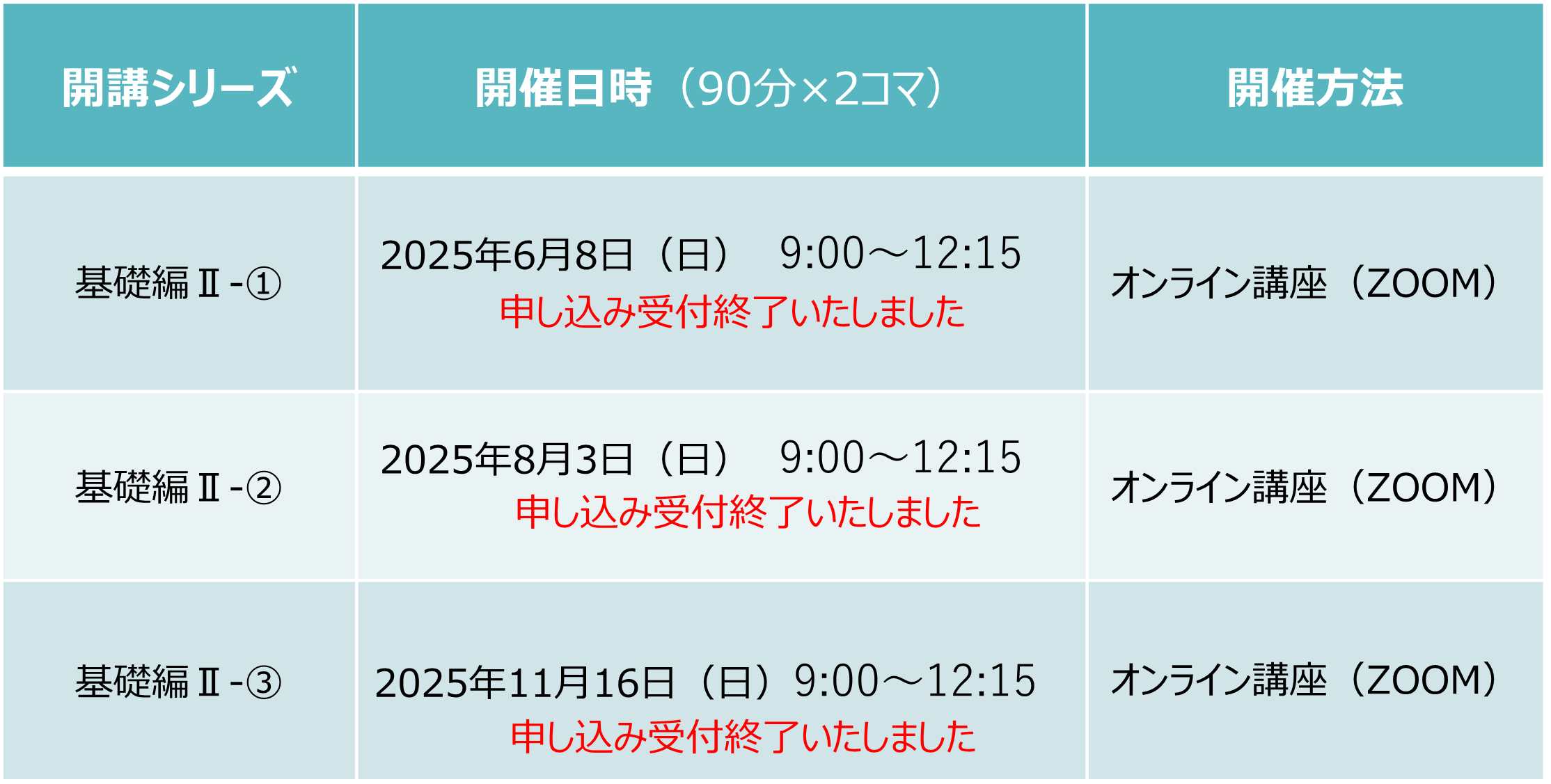 基礎編Ⅱ(①②③)は、①2025年6月、②8月、③11月に実施予定です。①→②→③の順番で受講して下さい。