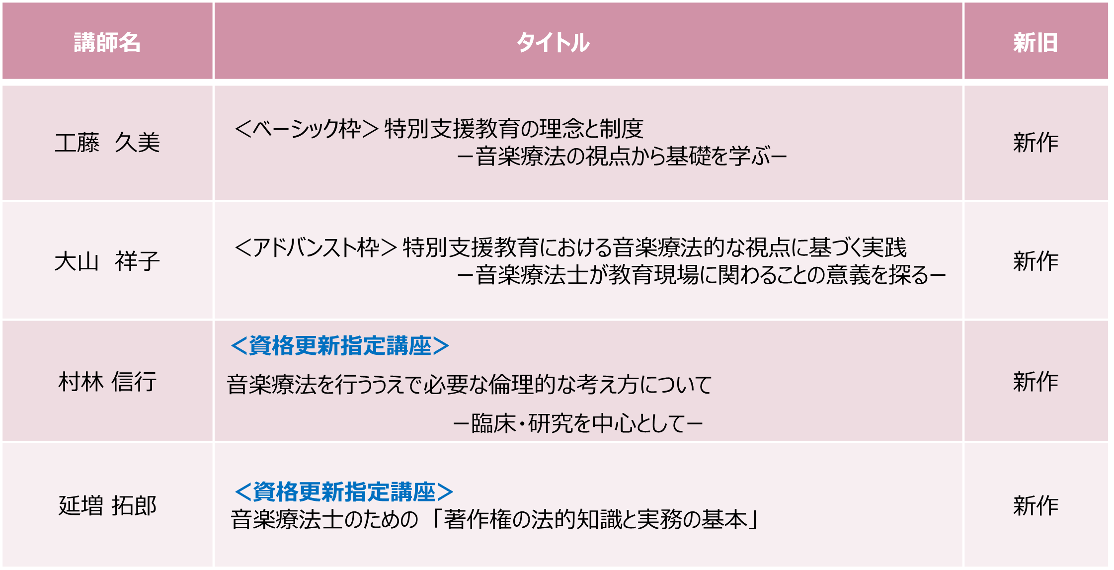 第3期では、臨床の基礎となる観察・記録・評価についてのお話をベーシック枠講座とアドバンスト枠講座の双方の講座を伊藤孝子先生にお願い致しました。是非、これらの講座を続けて視聴してみてください。また、今年度から始まりました「資格更新指定講座」につきましては、村林信行先生による「倫理講座2025年度最新版」と延増拓郎先生による「知的財産権基礎講座2025年度最新版」を配信中です。日本音楽療法学会の認定音楽療法士として資格更新を目指す方は、学会が配信する「資格更新指定講座」の中から5年間の資格有効期間に2講座以上を受講し、資格更新申請時に受講証を添付することが必修条件となりますので、ご自身の資格更新時期と照らし合わせながらご自分のタイミングでこれらの講座を受講されてください。2025年度オンライン講座も、学び続ける民・音楽療法士の皆さまには、学びの喜びが明日の臨床に生かされます様に、皆さまの積極的な学びの姿勢に則っていただきまして、興味のある研修・講習を自由に受講し、大いに学んで頂きますようよろしくお願い致します。